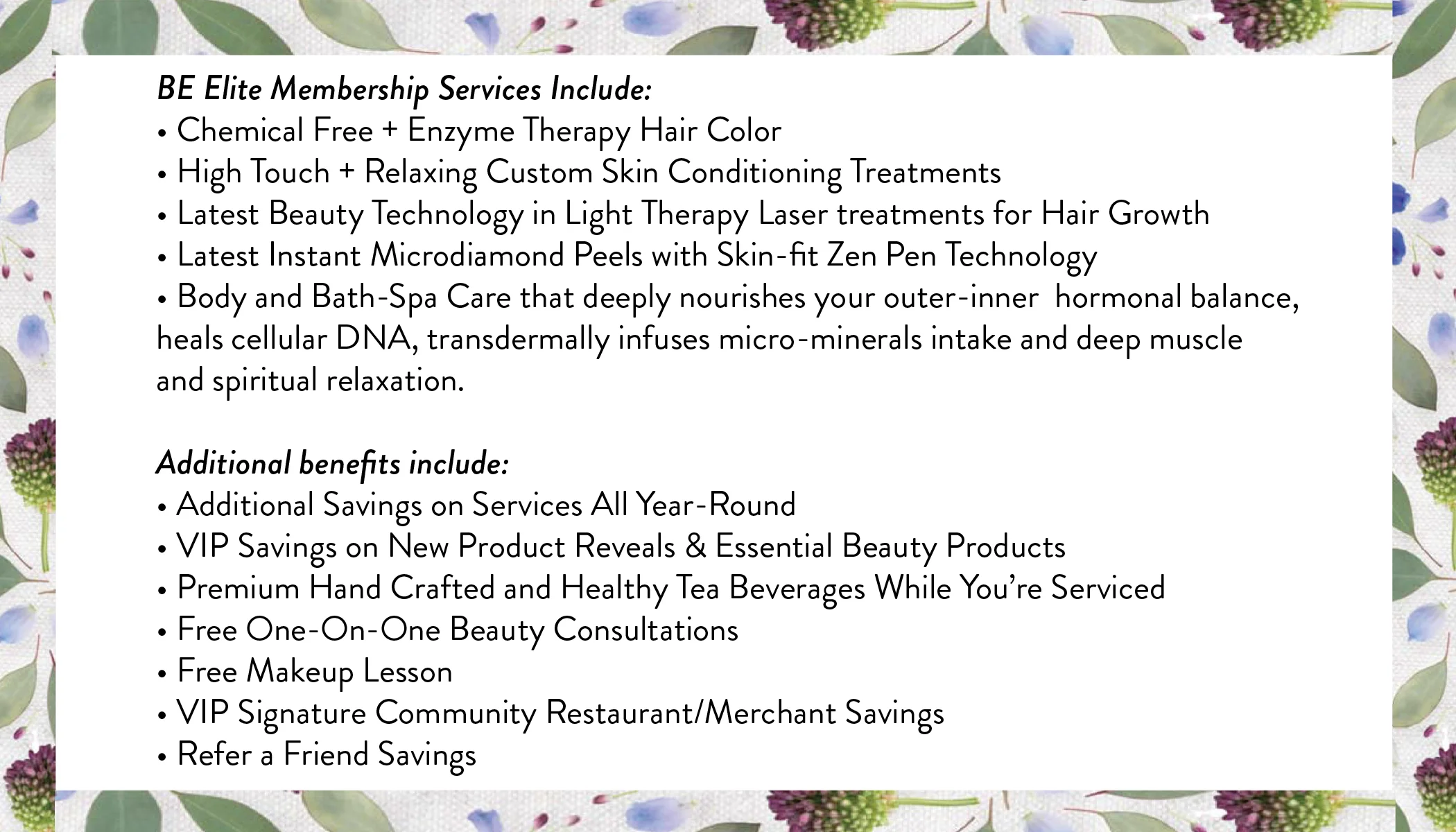 We use the phrase “Beautiful Health” because they are inseparable. Our incredible membership offerings are for women who value BIG PICTURE. This includes hormonal health, aging well through a toxin free lifestyle and investing in self-love through the most results based, home rituals and professional salon services.