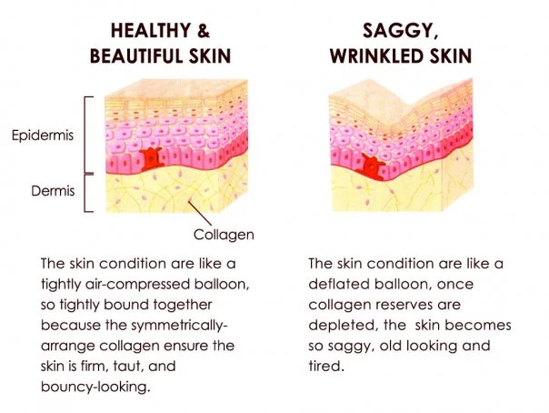 Hormones, stress and our biochemistry slowly breaks down on it's power to replenish itself of these two critical proteins. Therefore, you wake up one morning and "TA-DA," (or OMG), the wrinkles form, skin sags, and the skin is more susceptible to wear and tear due to unhealthy cells.